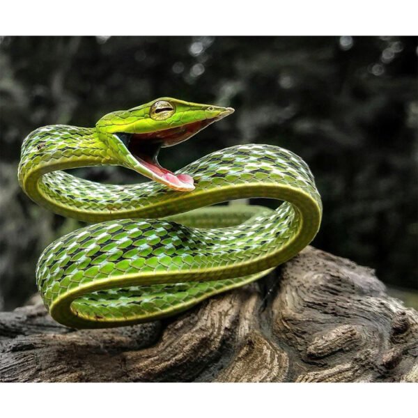 Életmód: Lassan mozognak, hogy indának álcázzák magukat a lombok között. Ha megzavarják őket kiterjesztik a testüket , hogy a fekete-fehér pikkelyek jól látszódjanak. Emellett kitárják a szájukat, és a fejüket a vélt fenyegetés irányába fordítják.