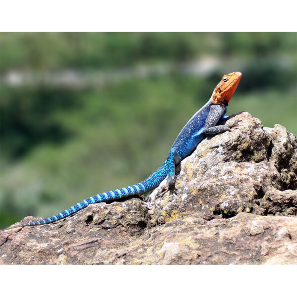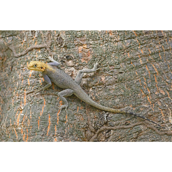 Teljes hossza 35–40 cm, aminek mintegy harmada a farok: ezzel a legnagyobb agámafélék (Agamidae) közé tartoznak. A nőstények alapszíne szürkésbarna, és nem teljesen megfelelő körülmények közt tartott hímeké is ilyen marad. Megfelelő körülmények között a hímek színpompás külsőt öltenek: fejük intenzív narancsvörös lesz, lábtöveik mélykékek, farkukon világosszürke és kék gyűrűk váltakoznak. A színek a szaporodási időszakban intenzívebbek. Mindig a domináns hím a legtarkább: az alárendelt egyedek egyre fakóbb árnyalatúak.