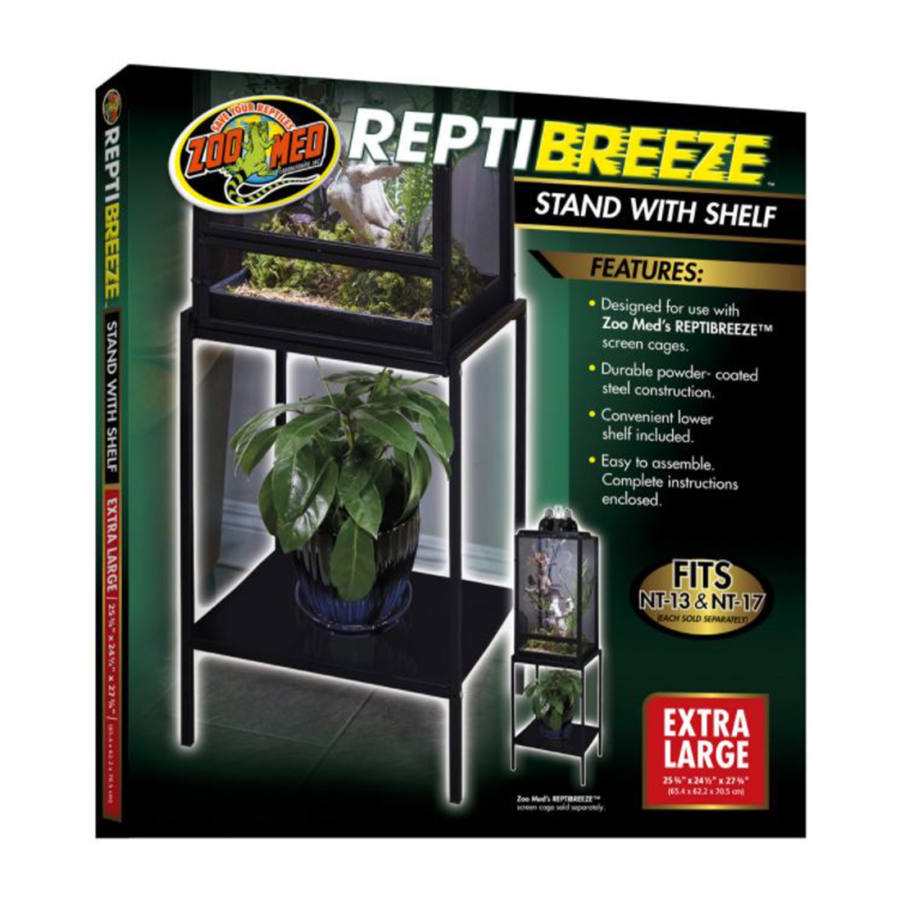 A ZooMed ReptiBreeze fekete acél állvány polccal egyszerűen összerakható feketére fújt rozsdamentes acél állvány, mely a ZooMed ReptiBreeze XL hálós terráriumokhoz készült, valamint ZooMed ReptiBreeze LED Deluxe XL hüllőketrechez. Az állvány ízléses kelléke a ketrecnek, direkt úgy tervezték, hogy a hálós terrárium tökéletesen illeszkedjen rá. Az állványon található egy polc is, melyre a kisebb kellékeket, felszereléseket, pl. automata párásítórendszert tehetjük, de egy dekoratív növény is helyezhető rá.